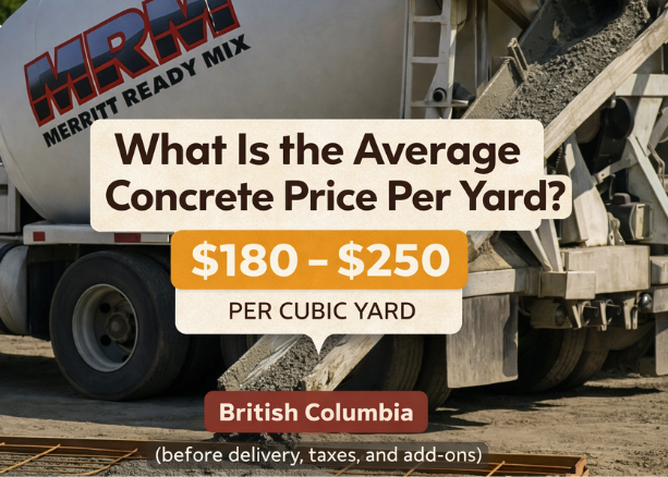 For Merritt and surrounding Interior BC areas, pricing may vary slightly depending on travel time, fuel costs, and the specific requirements of your project. Smaller loads or specialty mixes may cost more per yard than standard pours.
